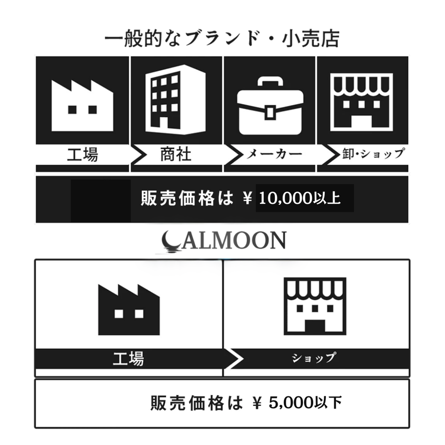 Calmoonは、店舗の土地代や人件費も最大限カットするため、ネットでのみ購入できるブランドだ。